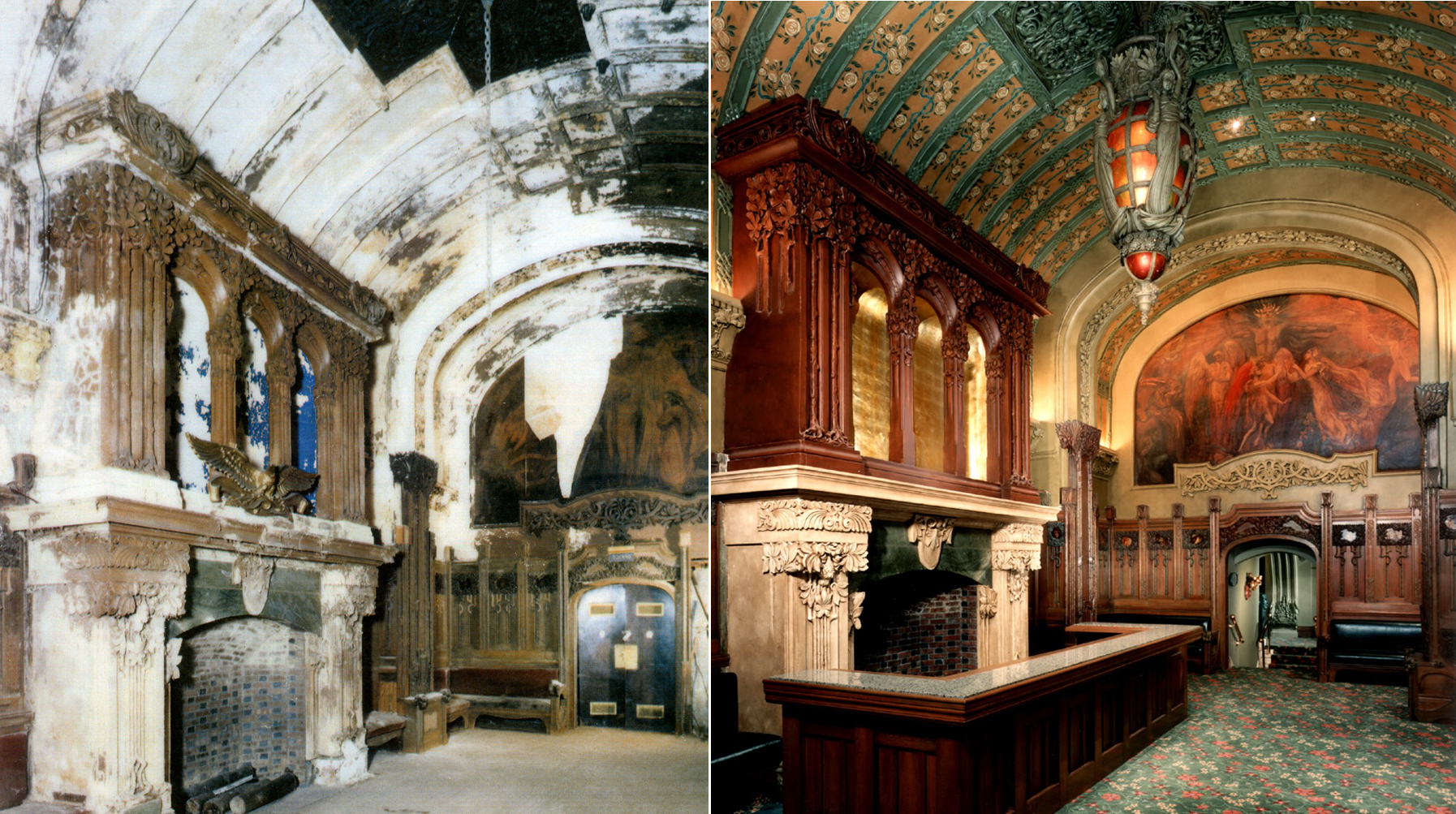 Before and after: The reception room 42nd Street’s New Amsterdam Theatre as Michael Eisner first saw it and after it was restored. Photos courtesy Evergreene Architectural Arts